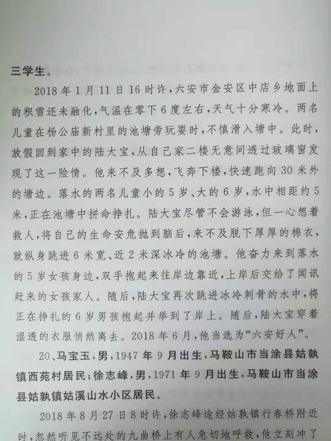 2018年1月11日16时许,六安市金安区中店乡地面上的积雪还未融化,气温在零下6度左右,天气十分寒冷。两名儿童在杨公庙新村里的池塘旁玩耍时,不慎滑入塘中。此时,放假回到家中的陆大宝,从自己家二楼无意间透过玻璃窗发现了这一险情。他来不及多想,飞奔下楼,快速跑向30米外的塘边。落水的两名儿童小的5岁、大的6岁,水中相距约5米,正在池塘中拼命挣扎。陆大宝尽管不会游泳,但一心想着救人,将自己的生命安危抛到脑后,来不及脱下厚厚的棉衣,就纵身跳进6米宽、近2米深冰冷的池塘。他奋力来到落水的5岁女孩身边,双手抱起来往岸边靠近,上岸后交给了闻讯赶来的女孩家人。随后,陆大宝再次跳进冰冷刺骨的水中,将正在挣扎的6岁男孩抱起并举到了岸上。随后,陆大宝穿着湿透的衣服悄然离去。2018 年6月,他当选为“六安好人”。
