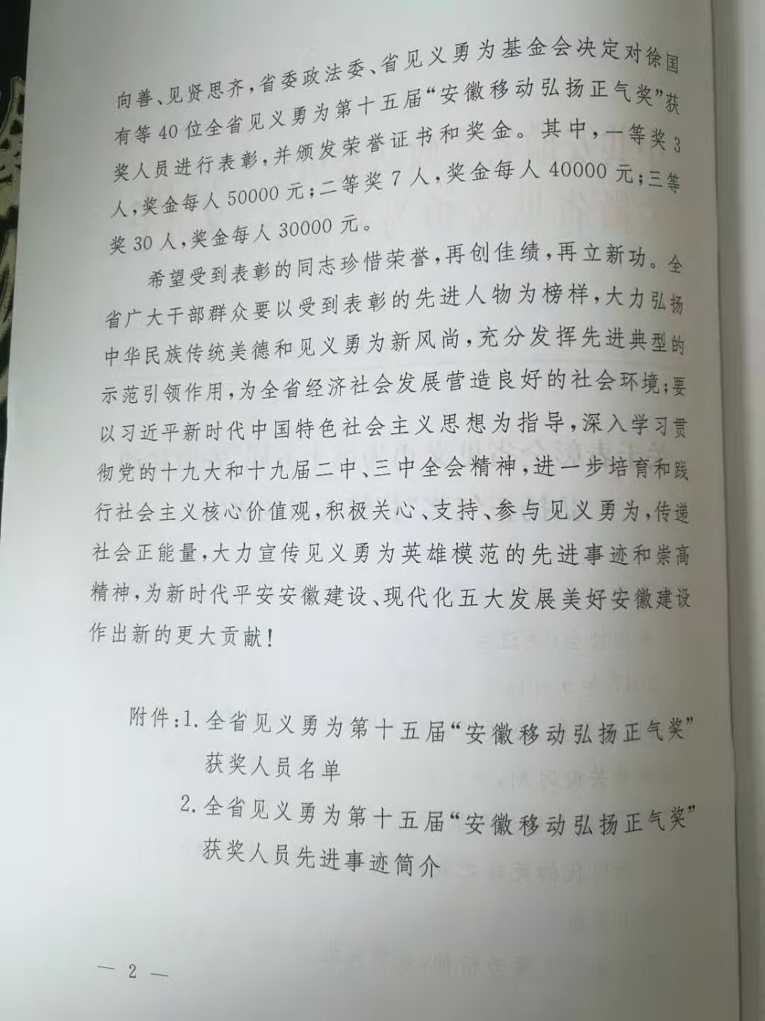 3月15日下午,安徽省见义勇为表彰大会在合肥举行。安徽省委常委、政法委书记姚玉舟出席并讲话。安徽省副省长、省公安厅厅长李建中主持会议。省人大常委会副主任刘明波、武警省总队司令员王宝音出席会议。会上,宣读了安徽省委政法委、省见义勇为基金会《关于表彰全省见义勇为第十五届“安徽移动弘扬正气奖”获奖人员的决定》,40位见义勇为英雄荣获表彰。我院15级艺术设计专业陆大宝同学因勇救落水儿童受到表彰。