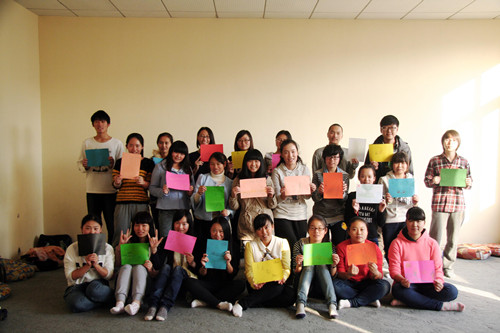 最后一个环节,在音乐中寻找自我。张静老师放了四段音乐,每一段音乐有不同的节奏和音律,并引导大家随着感觉舞动四肢。成员们利用事先准备好的丝巾,大家一起随着音乐的节奏而起舞,一条条丝巾在空中划出优美的曲线,释放着同学们心中的压力和烦忧。