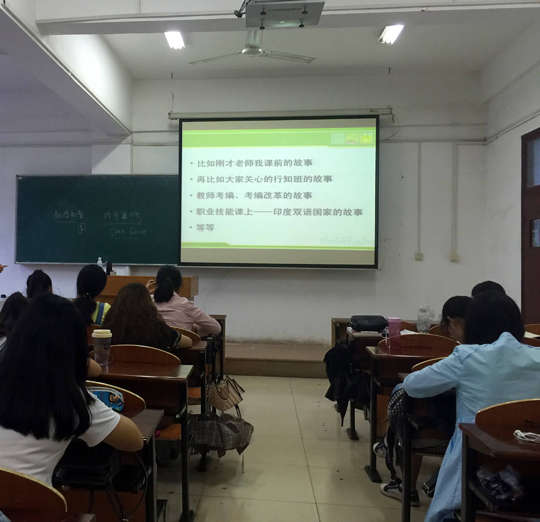 万爱莲首先以三个小问题开始此次课的讲授,分别是“什么是故事讲述”,“教师为什么要讲故事”以及“我们怎样才能讲好故事”。万爱恋指出:“一个好的故事讲述不仅能够调动课堂的气氛,更重要的在于能够启发学生的思考。这样就通过故事的讲述拉近了老师与学生的距离,构建了老师与学生的交流机制。”同时,她还提到故事作为课堂上必不可少的部分,讲好故事便是一名好老师的必备技能。而在ppt的最后,万老师也贴心的为大家整理了一份适合于课堂讲述的故事类型。