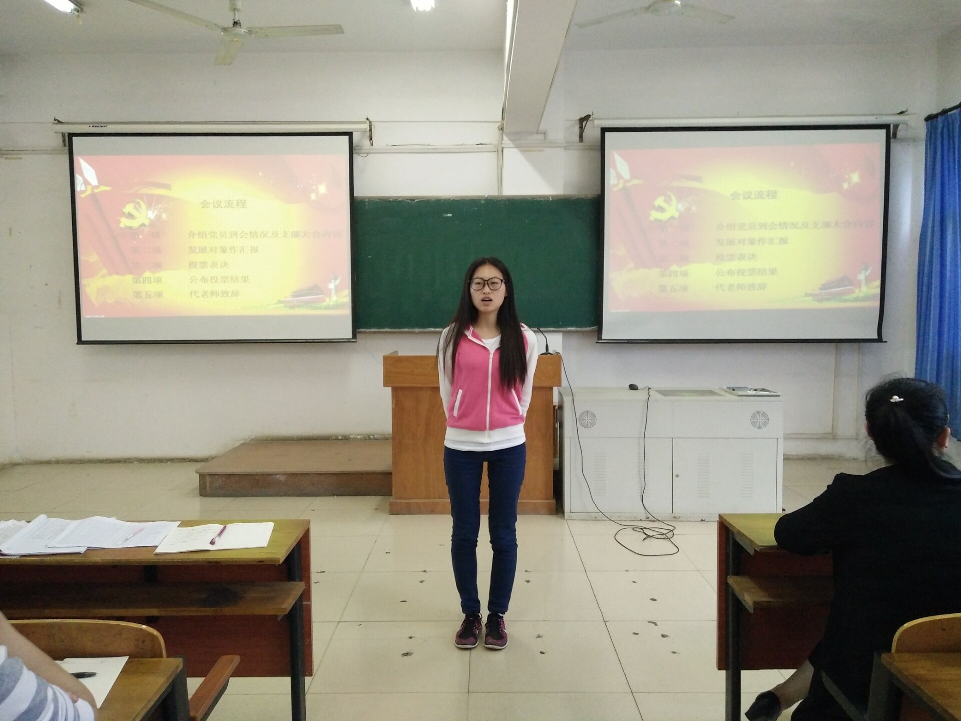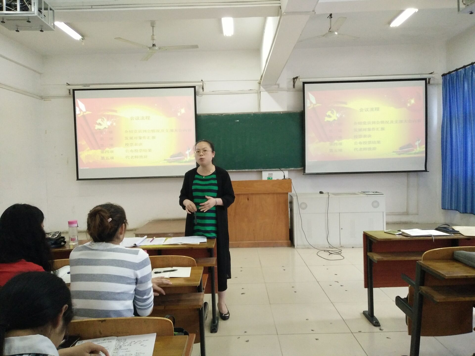 最后一项是由党支部书记代黎明老师致辞,她首先强调了党员发展的流程,其次对此次通过投票的27位发展对象提出了明确要求并表达了殷切的期望。她指出每一位党支部成员必须时刻保持其纯洁性和先进性,注重自身一言一行,积极争取进步及全面发展。至此,此次大会圆满结束。