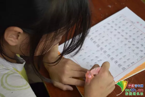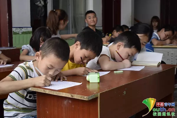 志愿者在讲解完上下结构、左右结构、半包围结构等结构的代表字后,孩子们对基本笔画顺序有了一定的认识。在此基础上,志愿者们让孩子用规范的笔画及字体抄写名诗《望天门山》。中国青年网通讯员李清宇摄