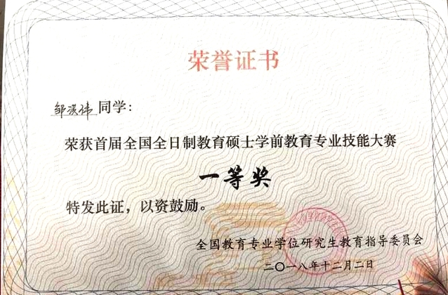 此次比赛是首届全国全日制教育硕士学前教育专业技能大赛,全国26所师范院校积极参赛。比赛形式主要包括活动设计与说课、游戏观察与分析、专业艺术技能三大项目。湖北师范大学与我校联合培养的学前教育专业硕士2017级研究生邹洪玮参加了本次决赛。在比赛中,邹洪玮同学的课程设计独特,其才艺古筝演奏娴熟,课堂教学感染力强,得到了现场评委的一致好评。在全国强手云集的参赛研究生中脱颖而出,荣获首届全国全日制教育硕士学前教育专业技能大赛一等奖,其研究生导师伍香平荣获优秀指导教师奖。