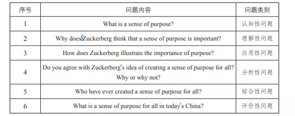 如上册第三单元课文为扎克伯格的演讲Create a Sense of Purpose for All,在进行本单元的教学设计时,笔者以问题贯穿课堂教学的始终(见表3)。