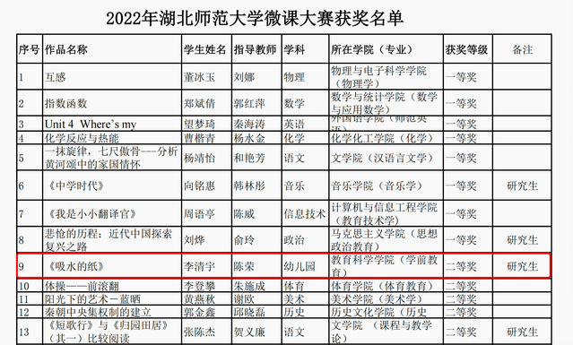 (通讯员李清宇)近日,湖北师范大学组织开展2022 年湖北师范大学师范生微课大赛暨《第四届全国师范生微课大赛》遴选推荐工作,我校2021级学前教育专业联合培养研究生李清宇的作品《吸水的纸》获二等奖。其中,一等奖8 项、二等奖 12 项、三等奖 26 项,并推荐一等奖和二等奖获奖作品参加全国微课比赛。