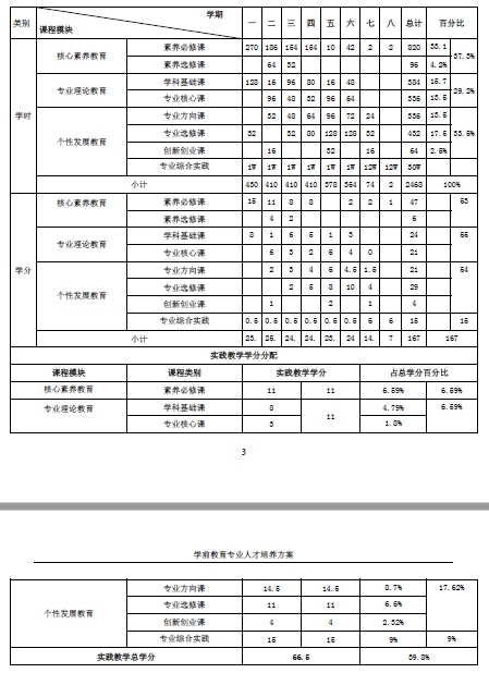 学分要求:学前教育专业167学分。其中专业选修课须修满29学分,素养选修课须修满6学分。
