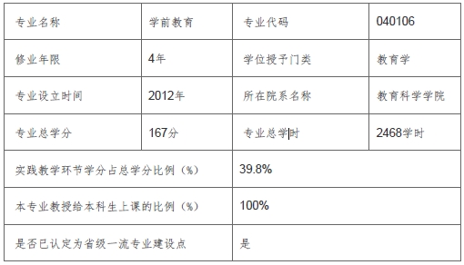 核心课程:学前教育学、学前儿童发展科学、学前儿童保育学、教育研究方法、学前特殊儿童教育、幼儿园课程、学前儿童语言教育、学前儿童艺术教育、学前儿童健康教育、学前儿童科学教育、学前儿童社会教育。