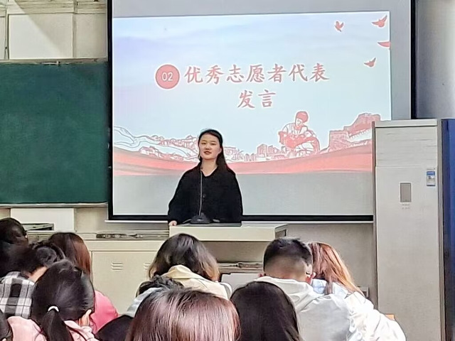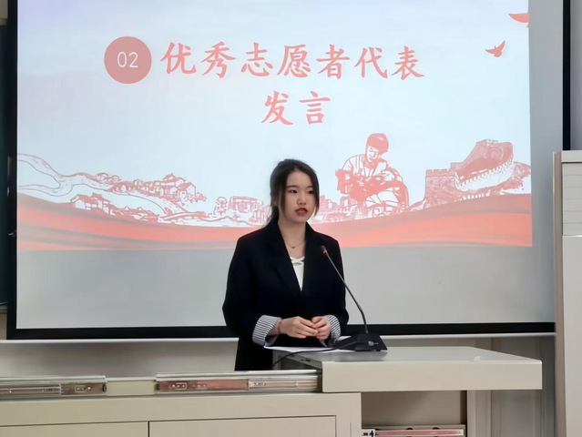 随后,两名优秀志愿者代表罗瑶和韩盼盼相继上台发表感想。罗瑶围绕学习、工作、思想、生活等四个方面展开分享,介绍学生工作和志愿服务经历,总结工作经验,展示个人成就,分享自身收获与喜悦。她表示,身为校团委主席团的一员,应发挥学生干部的表率作用,坚定为志愿服务事业奉献的决心,主动投身后续服务工作,不断提升个人能力素养。韩盼盼则用“苦中作乐”四个字概括学习经历,以个人事例展现为志愿服务事业奉献的决心,充分体现了她对志愿服务的热情,此外,她告诉同学们,要在有限的大学时光中,不断完善自身不足,发扬个人优势,并时刻保持乐观积极的心态,从容应对挑战,奋力突破难关。
