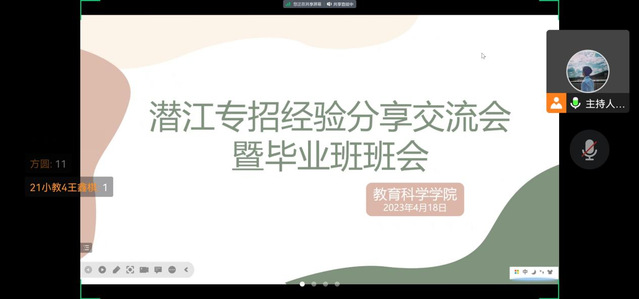 (通讯员朱轶)为助力教育科学学院(以下简称教科院)毕业生工作,切实帮助毕业生缓解就业压力,帮助在校学生了解目前的就业形势以及未来就业方向,推动教科院的就业情况稳步发展,营造良好的学院氛围。4月18日晚八点,教科院在腾讯会议召开潜江专招经验分享会。
