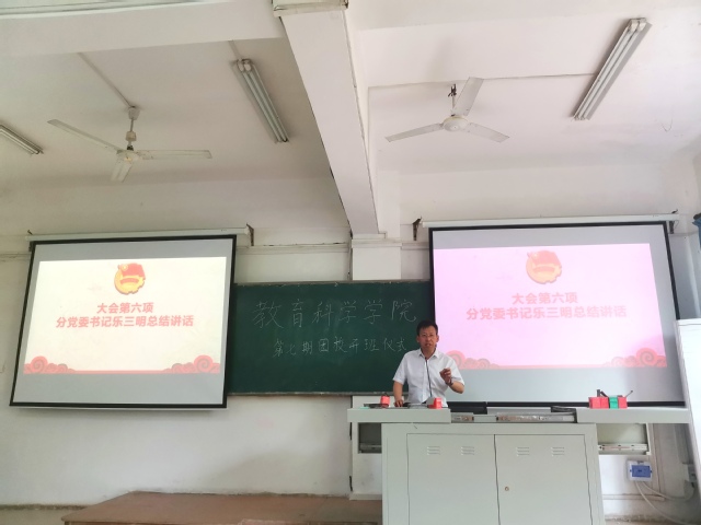 (通讯员蔡祎笑)5月4日中午,教育科学学院(以下简称“教科院”)于5308开展第七期团校开班仪式。教科院分党委书记乐三明、分党委副书记魏豪、分团委副书记唐志强出席本次活动。第七期团校全体成员参与此次活动,22级学前教育1班李沐风主持本次活动。