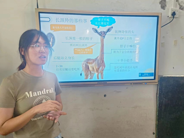 在课堂上,四叶草青年志愿服务队队员刘安娜为回市小学的同学们带来了各种各样奇特的恐龙,蜥臀目、兽脚亚目、腔骨龙超科、角鼻龙科、阿贝力龙超科……志愿者通过视频为大家讲解了恐龙的起源与灭绝,同学们听得津津有味。紧接着,志愿者刘安娜向同学介绍了一种奇特的濒危动物——长颈铃,通过多媒体课件让同学们知道了长颈铃是一种外貌奇特,生性高傲的动物,强调同学们要懂得爱护动物保护我们赖以生存的环境。