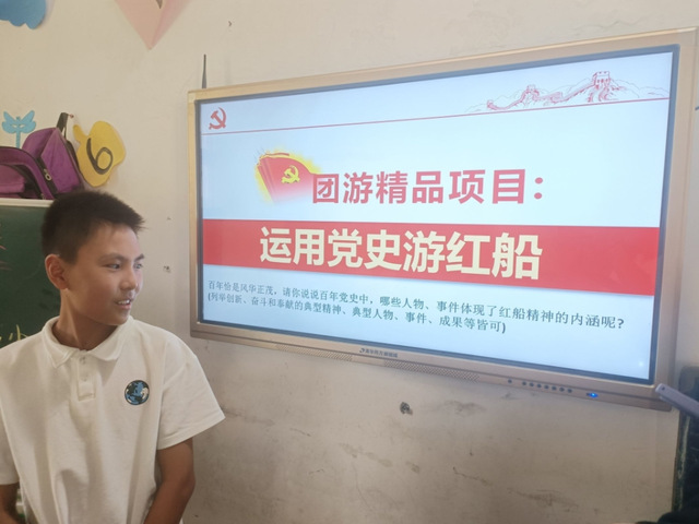 (图为学生与支教志愿者互动列举回答百年党史中有哪些事件体现了红船精神)