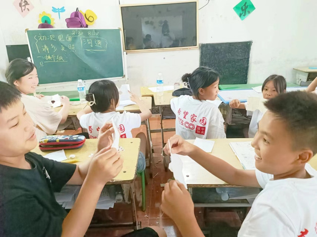 在团辅课上,四叶草青年志愿服务队志愿者邹贤艳带着五六年级同学进行了两个小游戏。第一个游戏“撕纸”,同学们分别在有沟通和没沟通的情况下听老师指令进行撕纸,结果发现,在没有沟通的情况下撕出来的纸没有一张是一模一样的,但在有沟通的情况下,撕出来的纸每一张都高度相似。第二个游戏叫做“盲人旅行”,顾名思义,就是一人扮演盲人,一人扮演引路人,引路人负责通过语言将盲人安全带到终点。