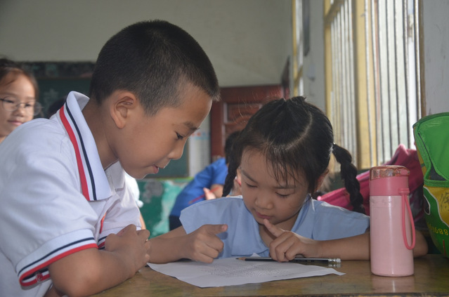 (图为二年级学生对一年级学生进行辅导)