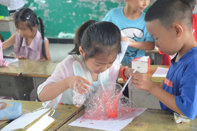 (通讯员李宇惠)为了让监利市分盐镇桃花小学的孩子们体验绘画的乐趣,培养孩子们的审美能力,激发孩子们的感知能力、想象能力与创造能力,2023年7月16日星期日,maya86com 四叶草青年志愿服务队第二分队的志愿者们在暑期“三下乡”社会实践活动中在监利市分盐镇桃花小学开展趣味泡泡画活动。志愿者蔡贝贝与志愿者夏玉博在桃花小学一二年级班级中开展泡泡画课程,带领一二年级的孩子们利用塑料杯、吸管、颜料和洗洁精,展开丰富的想象进行创作。
