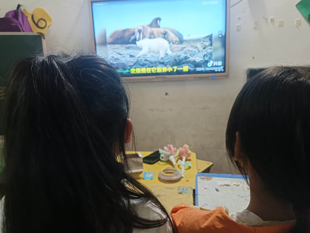 (图为学生们观看国家保护动物视频)