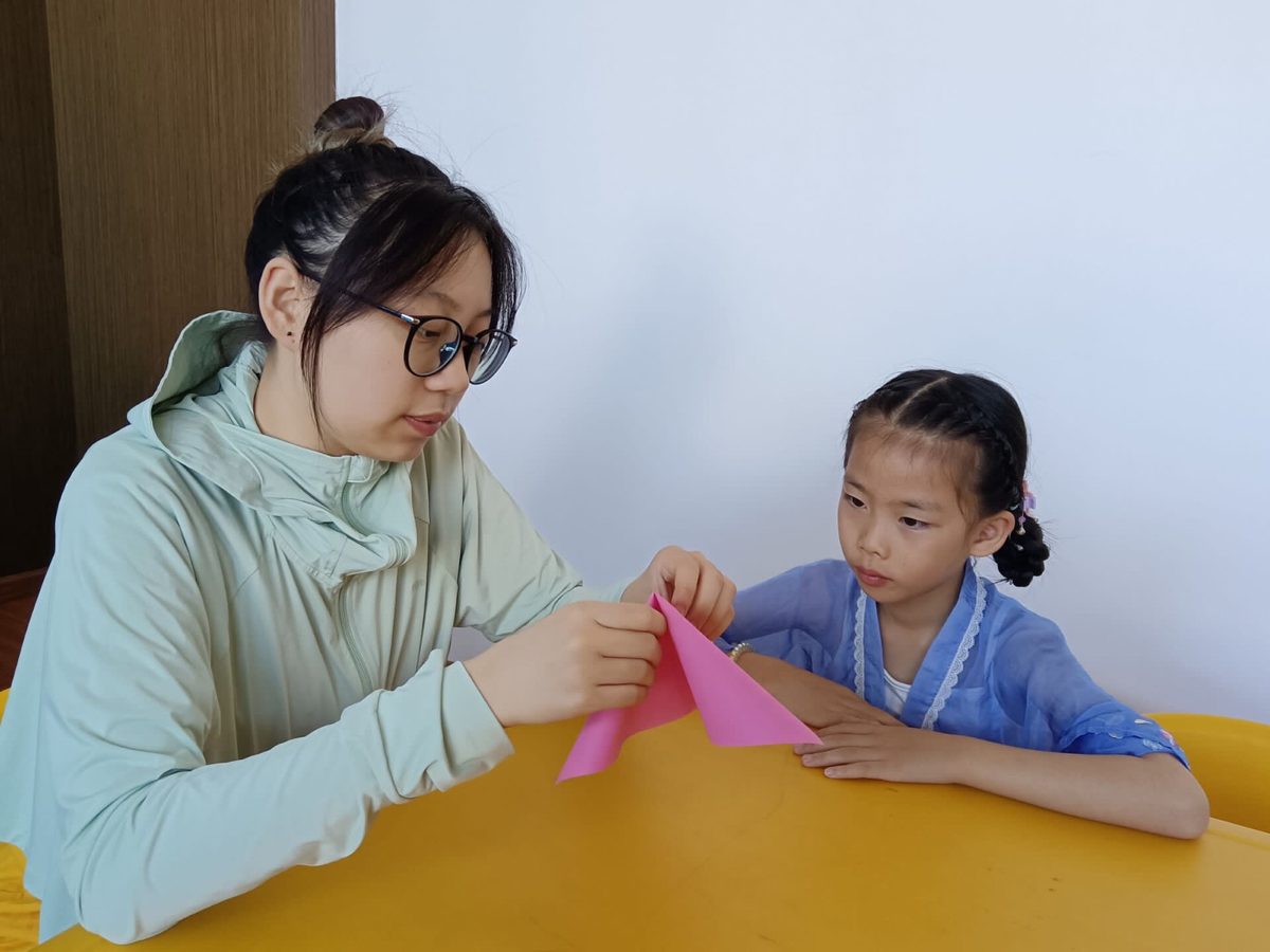 (图为志愿者教学生折纸)