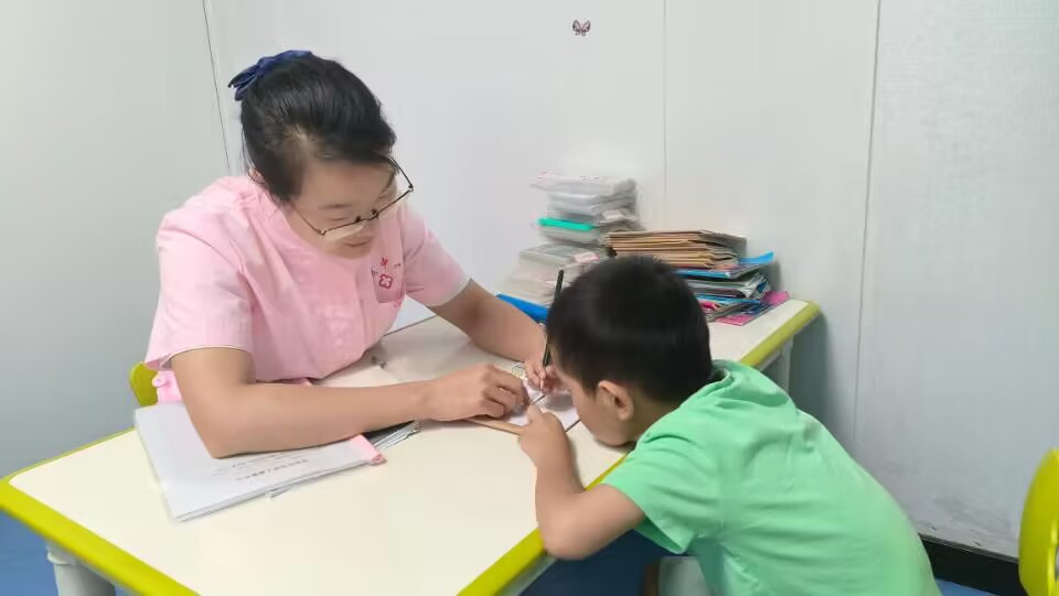 (图为儿童在老师的知道下练习写字)