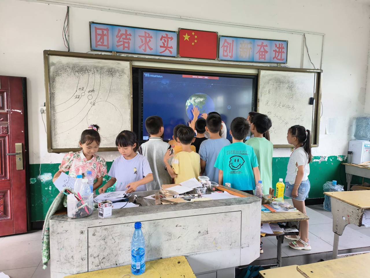 (图为志愿者在黑板上画星球图案)