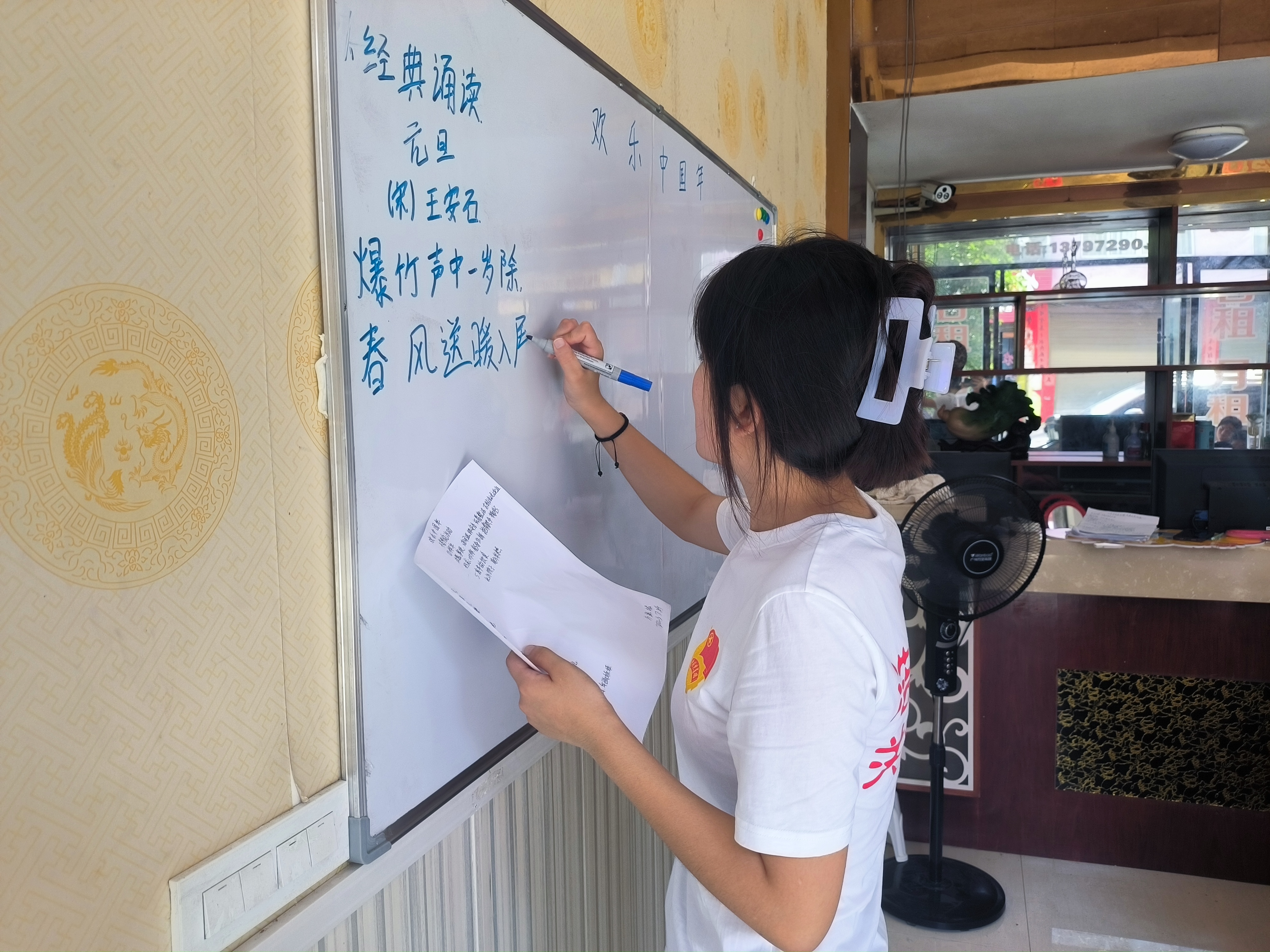 (图为志愿者在板书经典诗词,为课堂做准备)