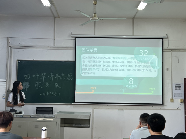 会议伊始,四叶草队长刘林智分别从辉煌历程、活动概览、活动守则三个方面介绍四叶草团队。刘林智带领队员们回顾四叶草的团队风采与荣誉,并且,她向队员们展示四叶草团队的宣传片及图片,让队员们进一步了解四叶草团队。接着,她详细地介绍支教安排以及后续的活动任务。随后,她强调安全第一,希望队员们能够遵守活动纪律。