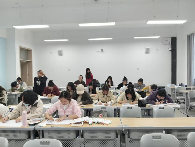 比赛期间,主持人有序安排好选手座次,选手们根据主体诗歌《村屋》开展创作。有的选手稍作思考后便迅速下笔,流畅的线条勾勒出栩栩如生的形象;有的则反复斟酌,精心描绘每一处细节。同学们的绘画作品线条流畅、色彩丰富,构图饱满、生动形象,用画笔绘心声,充分展现了同学们良好的专业素养。