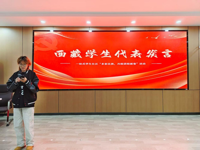 藏族学生代表平措曲珍发言。她用真挚的情感、淳朴的话语,感谢学院对少数民族学生的关怀,“一站式”学生社区开展了许多促进各民族学生团结的活动,希望以后各民族同学继续团结在一起,共同建设我们的学生社区。