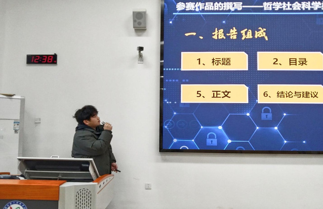随后,周彬从整体架构设计和内容要点解析两方面向同学们介绍如何撰写参赛作品,并具体分析了《哲学社会科学类社会调查报告》、《科技发明制作类参赛作品》和《自然科学类学术论文》三类主题作品。最后,他向同学们介绍参赛PPT的制作和答辩要点。