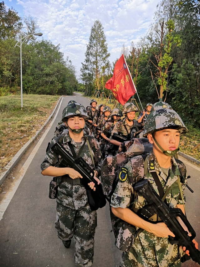 狼牙精英连的队员们按照部队训练的时间表,每天早上7:00,队员们在田径场开始集合训练。“在训一分钟,苦练六十秒”是指导老师李祖平对队员的训练要求。除了日常的体能训练和理论课程,29日下午,队员们身着整齐划一的全套迷彩服,左挎包右背壶,手持一只1:1模型95式自动步枪,在我校学工部门口集合,开始了围绕校园一周的全副武装徒步行军。出发前,2017级工程造价专业退役学生杨阳向参训队员做了充分的动员教育工作,并就此次行军方案、注意事项和安全常识进行了详细说明,他鼓励队员们既要端正态度,打起精神,又要互帮互助,团结一心。最后,全体参训队员用昂扬的斗志表达了认真完成任务的决心和勇气。