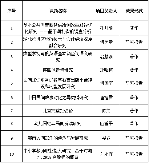 本网讯(通讯员刘菲)近日,湖北省社会科学界联合会公布了2020年湖北省社科基金一般项目(后期资助项目)拟立项名单,我校10个科研项目获立项资助。立项具体名单如下: