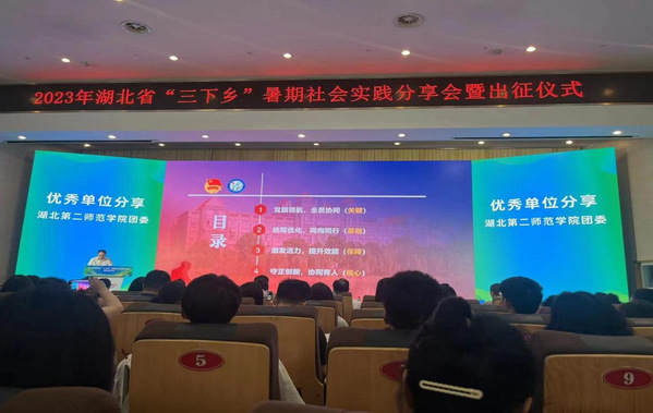 践行初心使命,以青春赴万丈光芒。我校团委在湖北省“三下乡”暑期社会实践分享会暨出征仪式作为优秀单位作典型交流。2023年学校共组建1203支团队6500余人,奔赴全国23个省56市(州)开展实践活动。目前,学校已经入选“全国大学生志愿宣讲团”7支,位居全省同类高校前列;34支团队入选全国“圆梦工程”服务农村未成年人传承优秀传统文化志愿服务团队,位居全省同类高校前列;入选国家级“七彩假期”示范团队5支,入选团队数与华中科技大学并列位居全省第一。