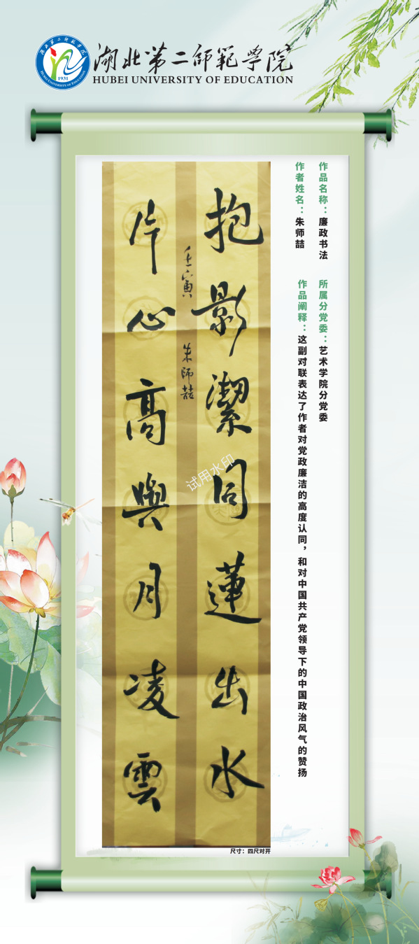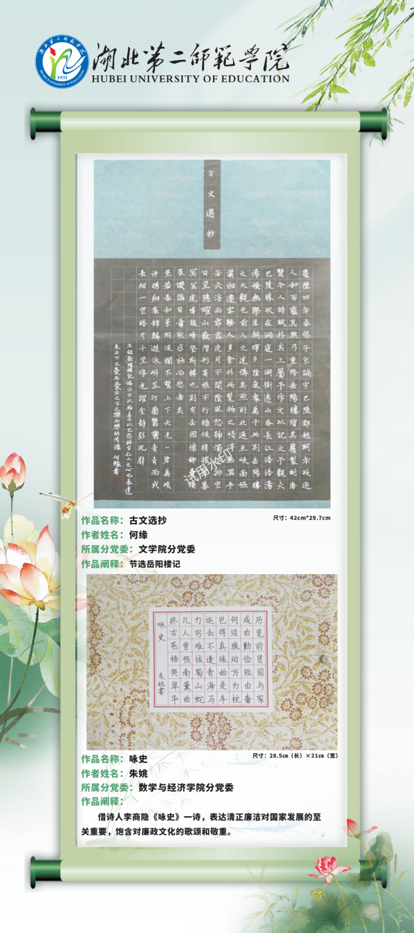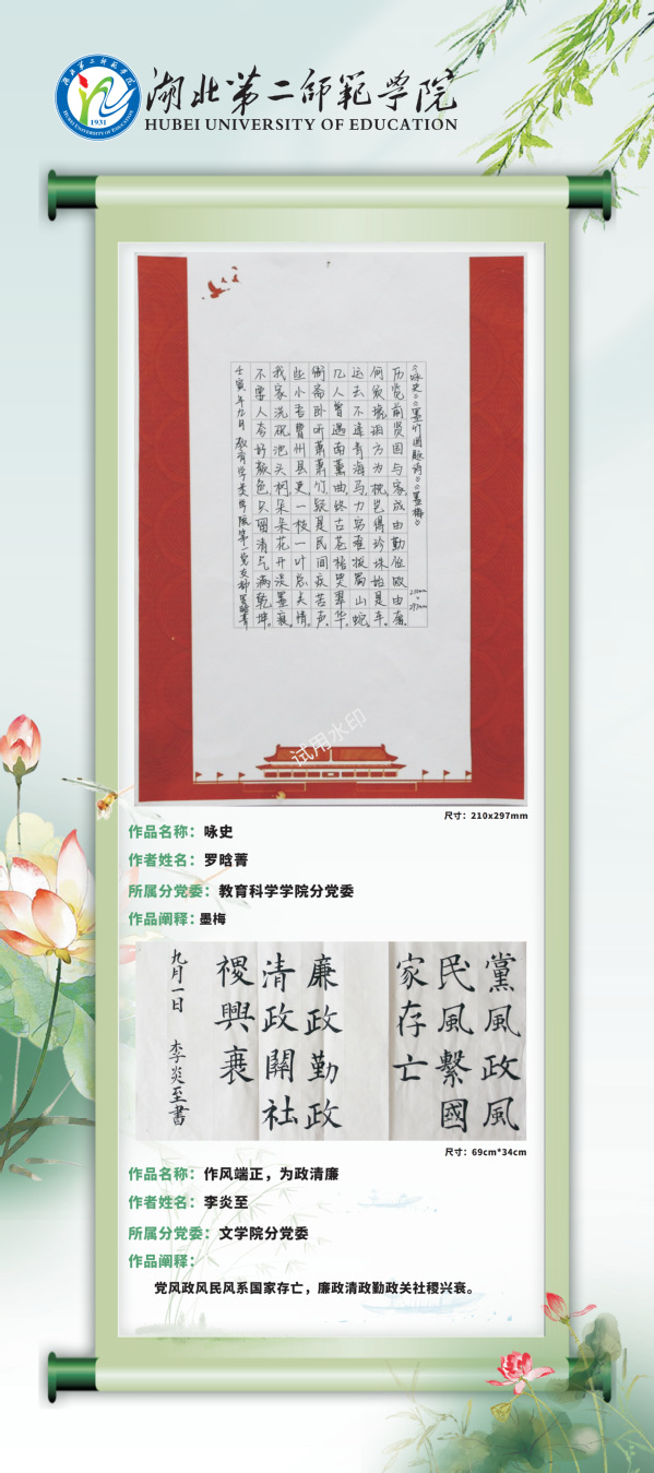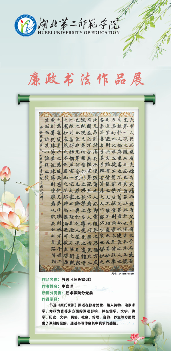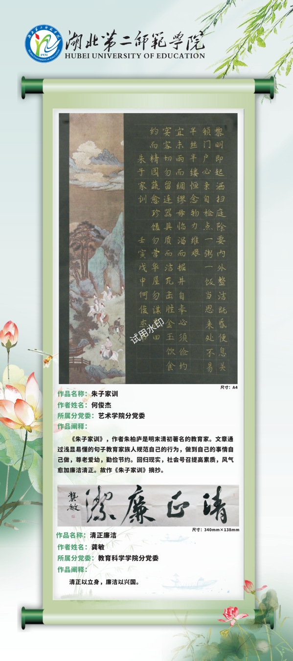 现结合党风廉政建设宣教月活动,通过校园网络平台对廉洁教育活动中征集到的廉洁视频和书画作品择优进行展示,引导学校师生进一步夯实清正廉洁思想根基、厚植廉洁奉公文化基础、培养廉洁自律道德操守、弘扬崇廉拒腐社会风尚,不断增强廉洁治校、廉洁从教、廉洁育人、廉洁修身意识。