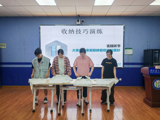 随后,大家前往教师素质训练中心S5209教室,以“知识讲解+实操”的形式举办培训讲座,羊晓君讲师介绍了整理收纳的基本原则及重要性,通过分享收纳案例从科学角度教大家如何合理利用空间、节省时间。接下来,羊老师通过提问、互动等方式,帮助同学们解决物品收纳、空间利用等方面的烦恼。讲座过程中,同学们积极参与,纷纷动手学习,通过实际操作掌握了收纳技巧,现场气氛活跃,受到师生一致好评。