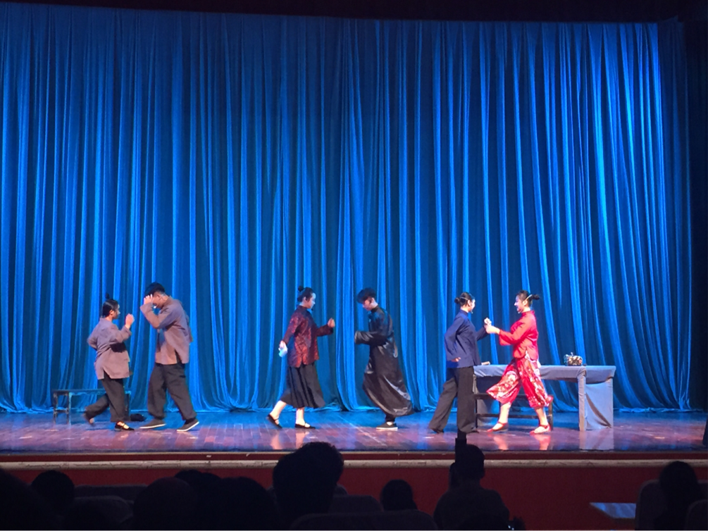 演出的所有道具和衣服都是王老师和导演场记通过很多渠道买来的,所以大家都很珍惜。演出之前有彩排,每人都换了衣服,大家的心情都很好,每个人都有条不紊的准备着,郝老师也在台下给我们指导。演出的时候大家也并不紧张因为我们都相信自己能够做的更好,这种默契的感觉真好。最后的演出两个组都非常顺利,表现的特别棒。观众的掌声让我感觉一切的一切都最好的安排,这三天时间的排练是值得的,感谢老师导演场记所有演员以及工作人员的努力。这次的演出经历将成为我大学一道靓丽的色彩。