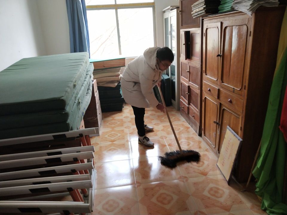 志愿者在校园勘察体育基础设施并进行义务卫生清洁